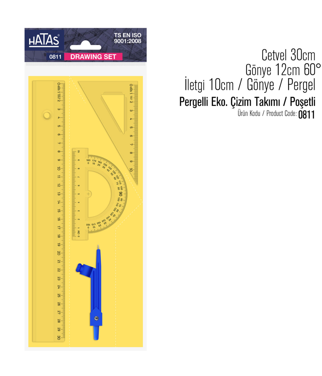 Hatas Ekonomik Çizim Takımı (Ürün Kodu: 0811), öğrenciler ve teknik çizimle ilgilenenler için pratik bir set olarak tasarlanmıştır. Dayanıklı malzemeden üretilen bu set, çizim ve ölçüm çalışmalarında uzun süreli kullanım sağlar. İçerisinde yer alan 30 cm cetvel, 12 cm 60° gönye, 10 cm iletki ve pergel ile temel çizim ihtiyaçlarını tek pakette karşılar.